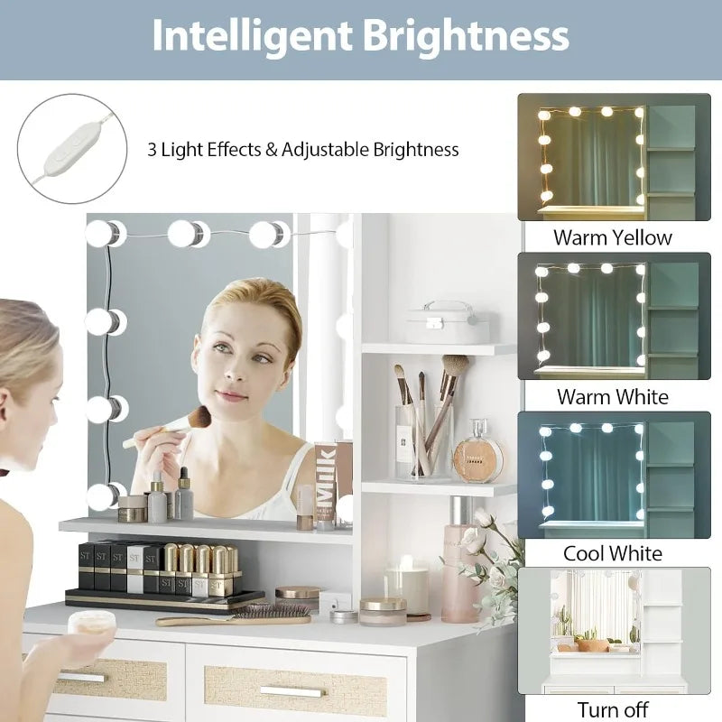 Vanity Desk with Mirror and Lights with Bedside Table